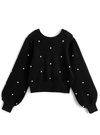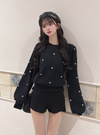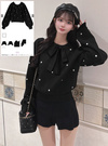 水玉柄をジャガード編みで表現したニットプルオーバー。ネック部分にはリボンをあしらい、フェミニンなワンポイントをプラス。