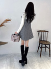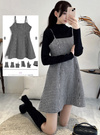 程よく厚みのあるクラシカルなツイード生地が目を惹くキャミワンピース。華奢なショルダーストラップがデコルテをきれいに見せてくれる。