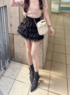 ふわりと重なるティアードフリルが目を引くレーススカパン。程よくハリ感のある素材がシルエットに動きをもたらす。