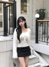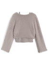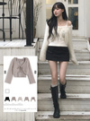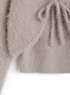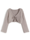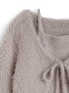 柔らかく滑らかな風合いのフェザーを使用したアンサンブルアイテム。フロントのリボンがフェミニンな印象を与えるポイントに。