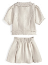ラメ糸を織り込んだ上品なツイード生地で仕立てたセットアップ。ジャケットはパールボタンやチェーンモチーフ、フリンジ加工を施し、華やかな印象に仕上げた。