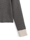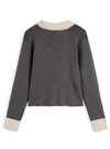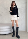 伸縮性のあるリブニット素材で仕立てたコンパクトなニットトップス。ふわふわのシャギーカラーが顔まわりを華やかに演出してくれる。