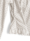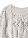 クラシカルな水玉柄プリントをあしらった涼しげな印象のトップス。胸元のレイヤード風のレースフリルやリボンがガーリーな印象を与える。