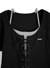 中にキャミソールを重ね着しているようなデザインが特徴のトップス。フロント部分にあしらった華奢なレースアップリボンもアクセント。