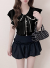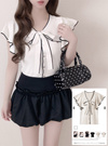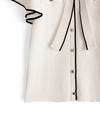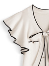 ボウタイリボンやフリルスリーブが、顔まわりを華やかに演出。