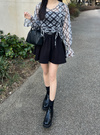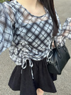 シアーメッシュ生地にチェック柄が施された個性的なセンスがお目立ち。ドロストリボンは自由に絞り具合を調節でき、スタイリングに変化をもたらす。