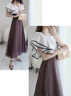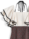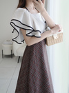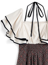 ボリュームたっぷりのフリルブラウスにチェックスカートをドッキングしたワンピース。配色のホルターネックやパイピングをあしらうことでメリハリ感をプラス。