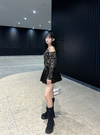 デコルテまわりにはスタッズをあしらい、エッジの効いた印象を与える。