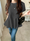 伸縮性がありケアが楽なエンボス生地を使用しているのでTシャツライクにコーデに取り入れやすい。程よくハリの素材なので裾のペプラムもきれいに広がる。