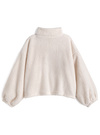 ゆったりとしたドロップショルダーとボリュームスリーブで、抜け感のあるシルエットを演出。