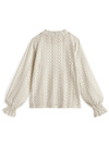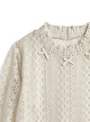 ハリのあるレース生地で仕立てたガーリームード漂うトップス。シャーリングネックに小さめリボンを並べることで程よい甘さをプラス。