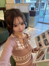 胸元にリボンを添えることで、フェミニンな雰囲気をプラス。