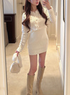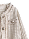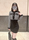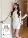 ツイード風デザインのカーディガンとタイトワンピースがセットになったアイテム。ラメ糸を編み込んだ生地に、フリンジやゴールドボタンをあしらった華やかカーディガン。