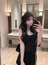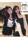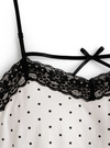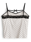 クラシカルな水玉柄プリントをあしらったショート丈キャミソール。配色になったレースの縁取りや小ぶりリボンがキュートなアクセント。