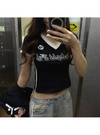 Vネックユニフォーム風ロゴプリントトップスの商品詳細情報のページです。