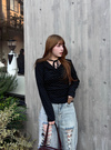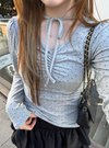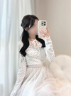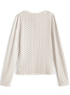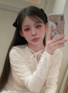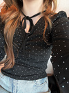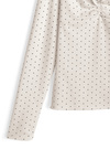 コーデのポイントになる細かい水玉柄プリントあしらったトップス。首元にあしらったチョーカーのようなリボンが甘さを添えるアクセント。