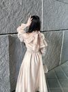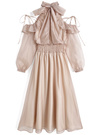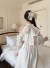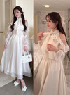 肩やバックネックのリボンが、華やかでエレガントな雰囲気を醸し出す。