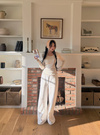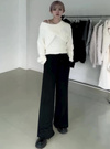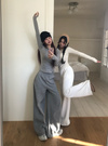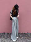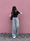 あまり窮屈感のないワイドシルエットで、ゆったりはけるスウェットパンツ。脚のラインを拾わないので、きれいなフォルムで着こなせる。