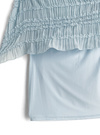 涼しげなシアー生地にシャーリングを効かせて立体感を出したセットアップ。切り替えのフリルディテールがフェミニンなニュアンスを演出するポイント。