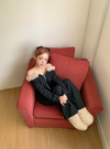 内側が柔らかな裏起毛になった、着心地の良いスウェット素材のセットアップ。大胆にデコルテラインを覗かせたオフショルダーが女性らしさを際立たせる。