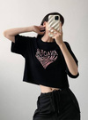 フロントにあしらったハート型のロゴプリントがキュートなアクセントのTシャツ。すっきりとコンパクトに着られるショート丈で、スタイル良く見えるのが嬉しい。