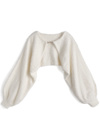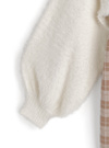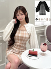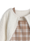 ふんわりとしたシャギーボレロとチェック柄ワンピースのアンサンブル。柔らかな風合いのボレロは着心地が良く、素肌の上からでも羽織りやすい。