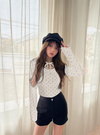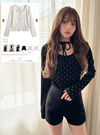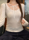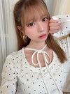 首元にあしらったタイのようなリボンがアクセントの、ガーリームード漂うドット柄トップス。