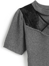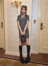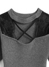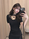 柔らかく着心地の良いリブニット素材で仕立てたミニワンピース。胸元のクロスデザインやレースドッキングが、華やかで色っぽい印象を与える。