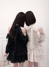 ハリのあるシアー素材にフロッキーの水玉柄をのせたミニワンピース。アメリカンスリーブ&肩開きデザインで素肌を覗かせ大人の色気をプラス。