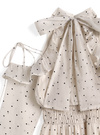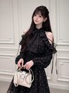 ハリ感のある生地にフロッキーの水玉模様をあしらったワンピース。すっきりとしたアメリカンスリーブに肩開き仕様で、大人っぽく肌見せができるデザイン。