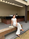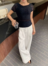ドレープネックがデコルテを美しく見せ、ほどよい抜けをつくるポイントに。