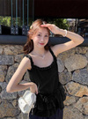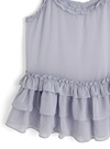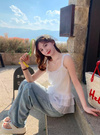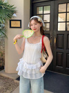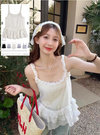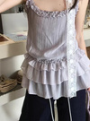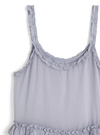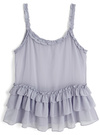 細かなニュアンスの入った透け感のある素材の涼しげなキャミチュニック。たっぷり施されたティアードフリルが動く度に揺れて可憐な印象に。