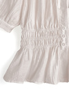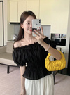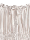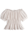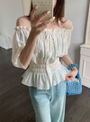 ギャザーを効かせたふっくらシルエットのオフショルブラウス。薄手のシアー生地が涼しげで可憐な雰囲気を演出してくれる。