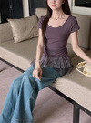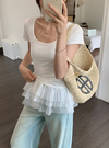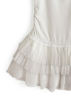 しっとりと肌触りの良いカットソーに異素材をドッキングした華やかトップス。三段に重ねたチュール生地がふんわり広がり美しいフレアラインをメイク。