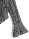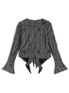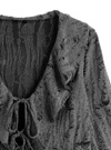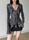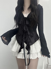 大胆なダメージ加工と透け感が目を惹く、エッジの効いたカーディガン。流れるようなラッフルフリルやリボンで女っぽさも兼ね備えたデザインに。
