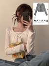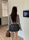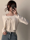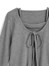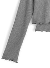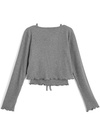 柔らかく伸縮性のあるリブ素材を使用した、優しい着心地のアンサンブル。袖や裾に施したメロウフリルがさり気ないアクセントに。