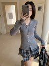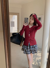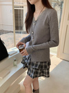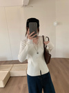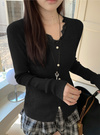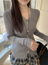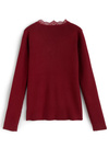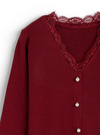 縦のラインを強調するリブニットで仕立てた華奢見えニット。ネックまわりのレース使いやフロントに並んだパールボタンが華やかさを添えるポイント。