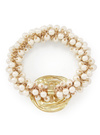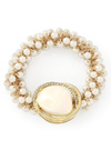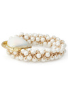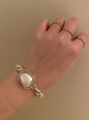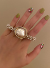 ラメ糸の入ったキラキラゴムに小粒のパールを散りばめたヘアゴム。オーロラのように輝く存在感たっぷりのストーンがアクセントに。