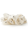 光沢感のある上品な生地にドット柄を散りばめたシュシュ。付けるだけで華のあるこなれたヘアアレンジに。