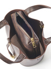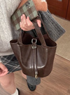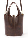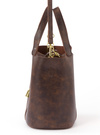 柔らかなフェイクレザー生地を使った、軽量で使いやすいバケツ型バッグ。ヴィンテージライクな表面感に加え、南京錠モチーフのパーツがレトロな雰囲気を醸し出す。