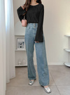 袖口のフレアラインが手元を美しく見せ、デニムからスカートまでマッチ。