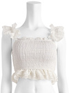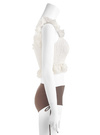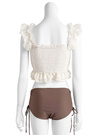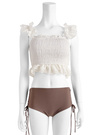 チェック柄のシアー生地が顔まわりを華やかに演出してくれる水着セット。立体的なフリルデザインをあしらうことで、フェミニンムードたっぷりに仕上げた。