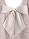 広めに開いたバックネックにシアーリボンを施した、後ろ姿にときめくデザイン。