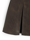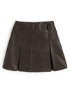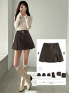 スタイリングにモードなニュアンスを添える、フェイクレザー素材のミニスカート。広めのプリーツでやや広がりを持たせたシルエットが女性らしさを引き立てる。