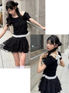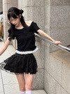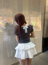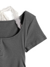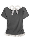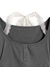 さり気ないレース使いがこだわりポイントのレイヤード風トップス。ネック周りは後ろで結ぶデザインで、バックスタイルまで抜かりなく可愛い。