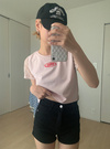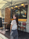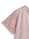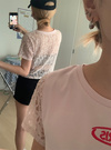 袖や背中部分を大胆なレース仕様にすることで甘めに仕上げたTシャツ。透け感を楽しめるアイテムなので、お好みのインナーを組み合わせれば上品な肌見せコーデが完成する。