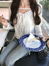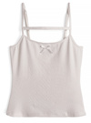 リボンディテールが愛らしいカーディガンとキャミソールのアンサンブル。キャミソールはデコルテ部分にリボンやレース、ストラップをあしらい一癖加えたデザイン。