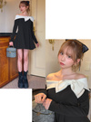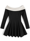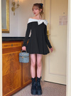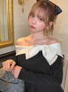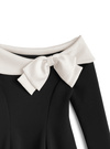 配色になった折り返しのオフショルディテールが目を惹くミニワンピース。立体的な大きめリボンをあしらった、乙女心をくすぐるデザイン。