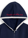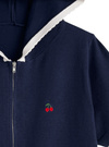 胸元のさくらんぼ刺繍とフード裏のレタリング刺繍が、遊び心をもたらす。