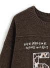 ヒョウ柄のナンバーロゴが存在感を放つニットプルオーバー。遊び心のある落書き風のメッセージロゴもこだわりポイント。